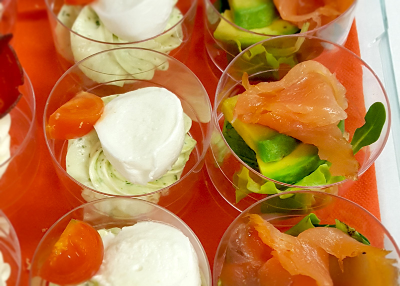 Vassoio di piccoli bicchierini con avocado e salmone, formaggetta e foglia di mocetta, spuma di formaggio alla rucola e pomodorini dried.