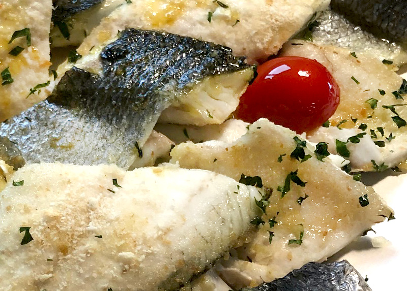 Filetto di orata (il prodotto potrebbe essere congelato), pangrattato al latte, olio, sale, aromi freschi (timo maggiorana, basilico, prezzemolo) agrumi(limone, arancia).(*)